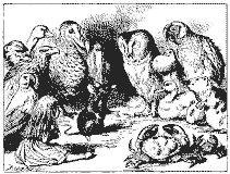 Nesse instante todo o baralho voou no ar, começando depois a cair sobre Alice; ela deu um gritinho, meio com medo, meio com raiva, tentando rebatê-las. A menina achou-se então deitada no barranco com a cabeça no colo da irmã, que gentilmente afastava algumas folhas secas que tinham caído da árvore sobre elas.