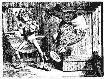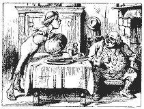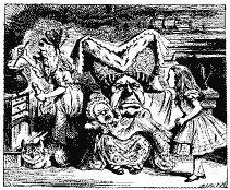 “Nunca!”, respondeu a Rainha furiosamente, jogando um tinteiro em cima do Lagarto enquanto falava. (O infeliz pequeno Bill tinha parado de escrever na lousa com o dedo, pois percebera que de nada adiantava; mas depois do ataque começou a escrever novamente usando a tinta que lhe escorria pela cara, enquanto não secava.)