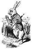 Não havia nada de muito especial nisso, também Alice não achou muito fora do normal ouvir o Coelho dizer para si mesmo “Oh puxa! Oh puxa! Eu devo estar muito atrasado!” (quando ela pensou nisso depois, ocorreu-lhe que deveria ter achado estranho, mas na hora tudo parecia muito natural); mas, quando o Coelho tirou um relógio do bolso do colete, e olhou para ele, apressando-se a seguir, Alice pôs-se em pé e lhe passou a idéia pela mente como um relâmpago, que ela nunca vira antes um coelho com um bolso no colete e menos ainda com um relógio para tirar dele. Ardendo de curiosidade, ela correu pelo campo atrás dele, a tempo de vê-lo saltar para dentro de uma grande toca de coelho embaixo da cerca.