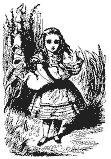 Alice comeu um pedacinho e disse ansiosamente para si mesma. “E agora? E agora?”, colocando a mão no topo da cabeça para sentir se estava crescendo. Ela ficou surpresa ao perceber que permanecera do mesmo tamanho. Para falar a verdade, é isso o que normalmente acontece quando se come um bolo, mas Alice já estava acostumada a não esperar nada senão coisas extraordinárias acontecendo, que as coisas acontecerem de uma maneira normal parececia chatisse.