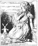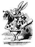 Depois de um tempo ela ouviu pisadinhas ao longe e rapidamente secou os olhos para ver o que vinha vindo. Era o Coelho Branco voltando, muito bem vestido, com um par de luvas brancas em uma mão e um grande leque na outra: ele vinha trotando com muita pressa, resmungando consigo mesmo: “Oh! Ela vai me matar se eu a fizer esperar!”