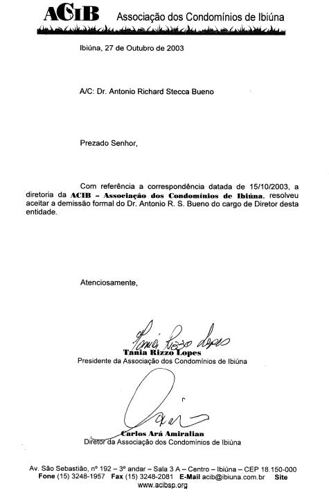 Com referência à correspondência datada de 15/10/2003, a diretoria da ACIB - Associação dos Condomínios de Ibiúna - resolveu aceitar a demissão formal do Dr. Antonio R. S. Bueno do cargo de Diretor desta entidade.