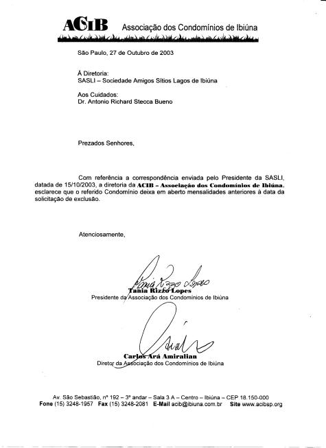 Com referência à correspondência enviada pelo Presidente da SASLI, datada de 15/10/2003, a diretoria da ACIB - Associação dos Condomínios de Ibiúna, esclarece que o referido Condomínio deixa em aberto mensalidades anteriores à data de solicitação de exclusão.