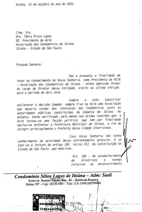 Carta enviada pelo Sr. Bueno demitindo-se (e desligando a SASLI da ACIB) em 15-10-2003