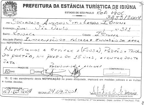 Notificação da Fiscalização da Prefeitura Municipal de Ibiúna