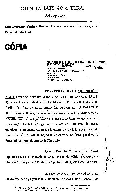 FRANCISCO TEOTONIO SIMÕES NETO, brasileiro, portador do RG 3.193.375-0 e do CPF 021.786.138-53, residente e domiciliado à Rua Dr. Martinico Prado, 260, apto.71, Sta. Cecília, São Paulo, Capital, proprietário de lotes no LOTEAMENTO Sítios Lagos de Ibiúna, fundado em seus direitos constitucionais (Art. 5o., XXXIII; XXXIV, a e b; XXXV;), e em observância ao que dispõe a Constituição paulista (Artigo 90, III), em seu interesse, de outros proprietários no supramencionado loteamento e de toda a população do Bairro da Ressaca em Ibiúna, vem, denunciando fatos, peticionar à Procuradoria Geral do Estado de São Paulo: