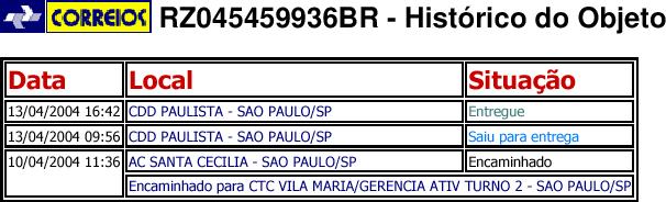 A carta para o escritório da SASLI em São Paulo (objeto RZ045459936BR, que pode ser rastreado no site dos Correios), foi entregue em 13.04.2004: