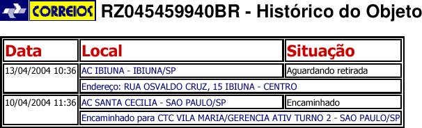 A carta para a sede da SASLI, enviada para a C. Postal 192, Ibiúna, (objeto RZ045459940BR, que pode ser rastreado no site dos Correios), em 13.04.2004 já estava lá, aguardando ser retirada: