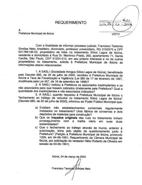 Requerimento à Prefeitura de Ibiúna em 04-03-2004 (Protocolo 1433)